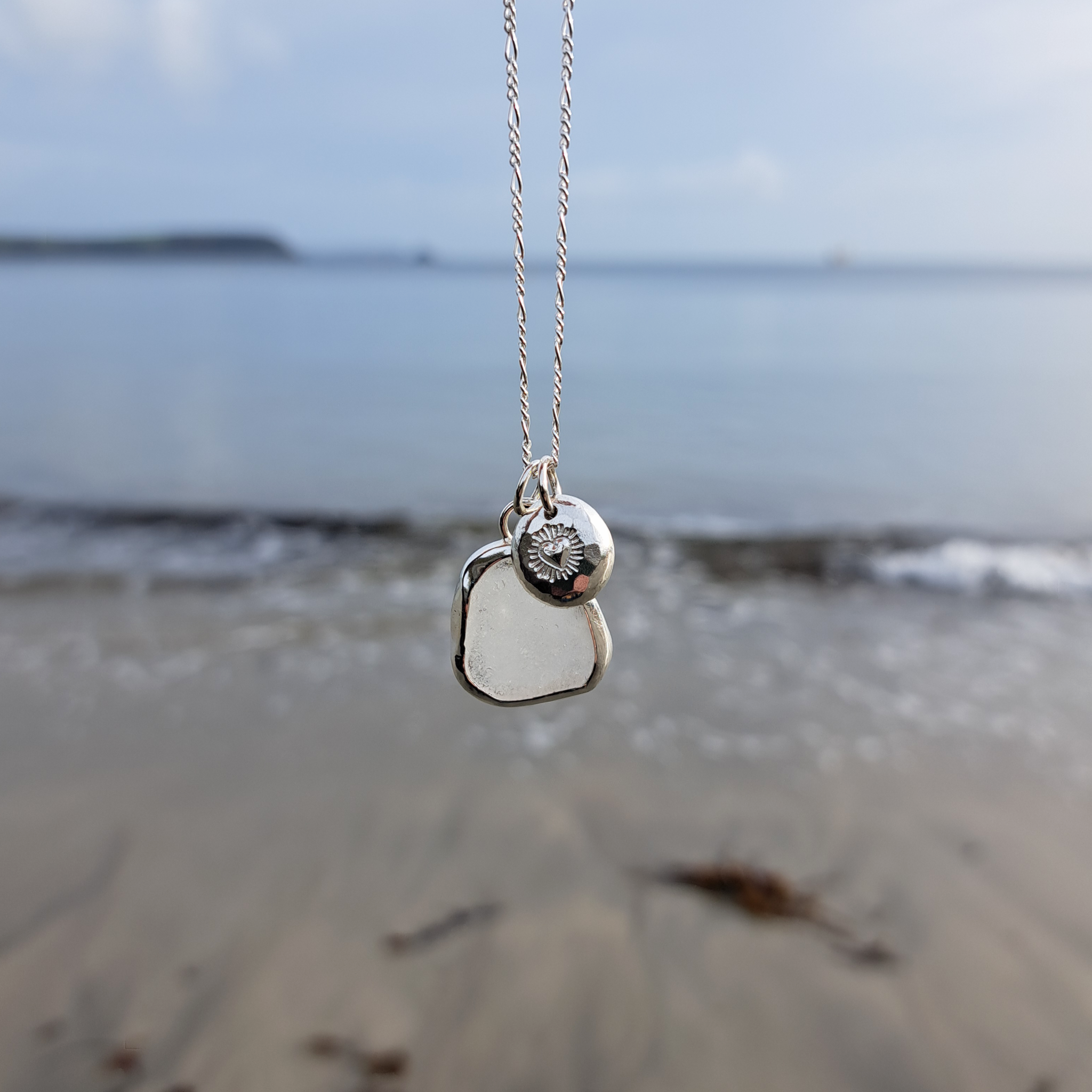 An elegant frosted white chunky Cornish sea glass pendant paired with a shining heart recycled silver pebble charm.